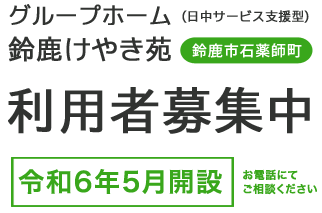 『グループホーム鈴鹿けやき苑』では、令和6年5月開設につき利用者の募集中です。